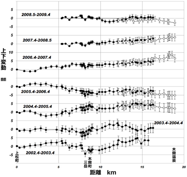 御嶽山は1970年代後半から活発な群発地震が始まり、1983年に有史初の噴火となりました。水準測量により群発地震が活発な時は群発地震震源域で、火山活動の時は山頂部で隆起が推定されました。